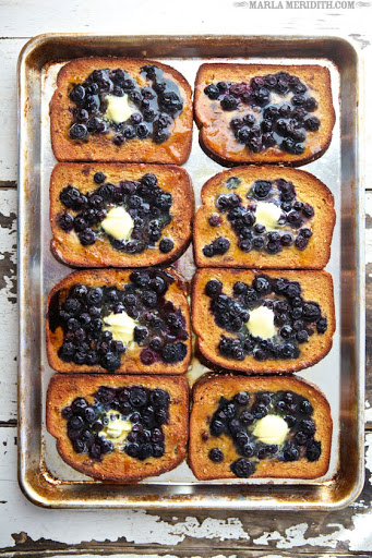 Top bread with thawed blueberries. Bake for 25-30 minutes, until egg batter is soaked in & bread is golden brown.
