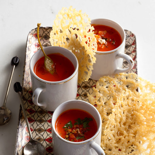 •Divide soup among small cups or shot glasses. Garnish with parsley, olive oil, minced bell peppers, toasted coriander seeds, caper berries, feta, or minced hard-boiled egg.