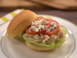 Place one slice each of tomato and lettuce on the slider buns. Top each with 2 ounces of chicken and 1 tablespoon blue cheese.