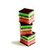 Spoon untinted batter into 1 pan. with metal spatula (offset if possible), spread batter evenly (layer will be about 1 inch thick). Repeat with red batter in second pan. repeat with green batter in remaining pan.