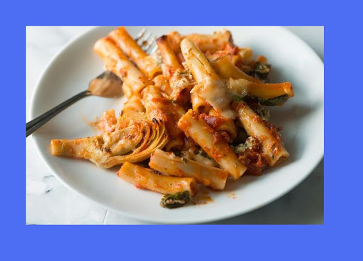In a large skillet, sauté the sausage over medium-high heat for 5 to 6 minutes, breaking it up as it cooks. Drain the liquid from the cooked sausage and add it to the ziti along with the artichoke hearts, spaghetti sauce, crushed tomatoes, garlic powder, pepper, and 3 cups of the mozzarella cheese; mix well.