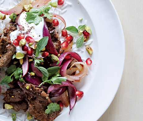 Serve lamb over rice, topped with yogurt, pomegranate seeds, pistachios, and herbs.