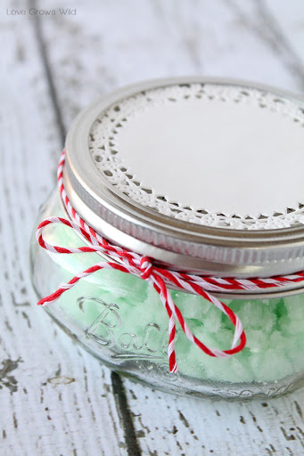 Spoon scrub into air-tight containers (such as a mason jar) and decorate with twine or ribbon.