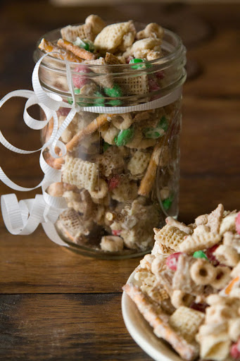 In a large bowl (or wok, or giant tupperware or punch bowl) combine the Cheerios, Chex, Pretzels and m&m’s. Mix them up a bit, making sure that everything is evenly distributed.