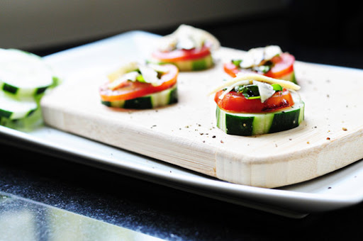 1.Arrange sliced cucumbers on a serving platter. Top each with 1 tomato slice, a sprinkle of basil, 1 Tablespoon Gouda cheese and a drizzle of Balsamic Vinegar.