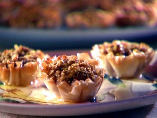 Place pistachios, pecans and almonds on a baking sheet and toast in oven until golden and fragrant, about 8 minutes. Let nuts cool slightly and add to a food processor along with the lemon zest, 3 T. sugar, butter, cinnamon, salt, and vanilla and pulse to combine. Place mini filo shells in wells of 2 mini cupcake pans. Add 1 teaspoon of the nut mixture into each shell. Bake until filling is hot, about 10 minutes. Meanwhile, in a small saucepan over medium heat add the water, 1/4 cup sugar and honey and bring to a boil. Reduce heat to a simmer and cook until reduced and slightly thickened, 8 to 10 minutes. Pour 1 teaspoon syrup into each cup and allow it to soak in, then repeat with another teaspoon. Refrigerate and least 5 hours, or overnight.