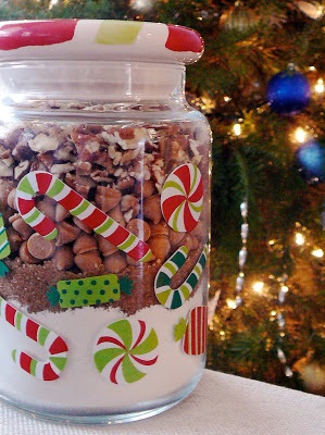 Combine flour, baking soda and salt in a small bowl. Spoon into 1 quart, widemouthed canning jar. Layer remaining ingredients in order given, making sure to pack down each layer firmly. Clean inside of jar with a dry paper towel after each layer. Decorate lid by cutting fabric into a 7-inch wide square or circle. Secure with a rubber band and tie with a decorative ribbon and accents.
