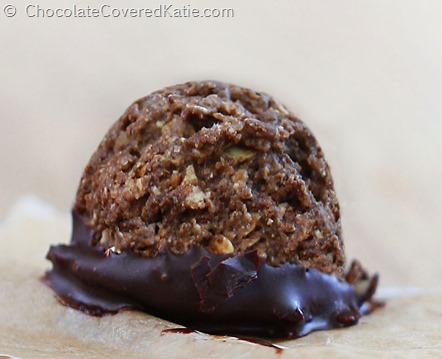 Combine all ingredients except chips in a tall dish or pyrex. If using a microwave, heat two minutes. Stir, then microwave one more minute OR longer, until firm enough to scoop out into ball shapes. (Alternatively, you can cook on the stovetop until it’s firm enough to scoop out into balls.) Scoop balls onto a greased cookie tray: I used a mini cookie scoop /melon baller, but a spoon or ice-cream scoop also work. Bake at 360 F for 14-16 minutes. So they do not fall apart, be sure to let the cookies cool at least 10 minutes before removing from tray. Line a plate with wax paper and dip each cooled cookie in melted chocolate. Place the cookies on the wax paper, and refrigerate or freeze to set the chocolate. Makes 12-22 cookies, depending on the size cookie scoop used.