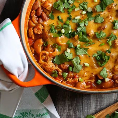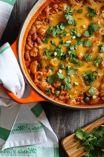 Turkey chili with taco seasoning, beans, and pasta shells topped with cheese – this is pure comfort in a bowl and it's packed with protein and fiber so it fills you up.