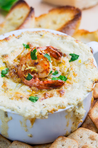 Mix the shrimp, pan sauce, cream cheese, mayonnaise, sour cream, parsley, mozzarella and parmesan and pour it into a 2+ cup baking pan.
