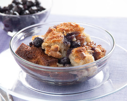 Cut cooled bread into 1-inch cubes. In a large bowl beat eggs. Add cream, sugar, vanilla and blend. Fold in blueberries and baking chips. Add mixture to bread cubes and fold until cubes are evenly coated. Pour into a sprayed 9x13-inch baking pan. Let sit 15-30 minutes while bread soaks up mixture. Bake at 350°F 50-60 minutes (cover with foil last 15 minutes if necessary to prevent over browning). Let stand for 5 minutes before serving. Top with sauce to serve.