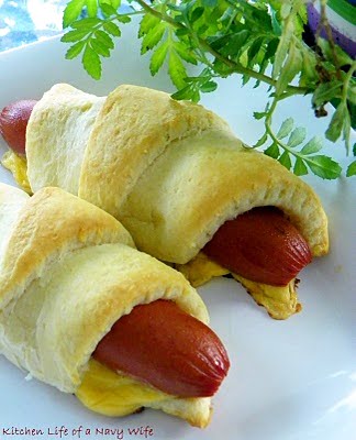 Heat oven to 375. Slit hot dogs to within 1/2 inch of ends; insert 3 strips of cheese into each slit. Separate dough into triangles. Wrap dough triangle around each hot dog. Place on ungreased cookie sheet, cheese side up. Bake at for 12 to 15 minutes or until golden brown.