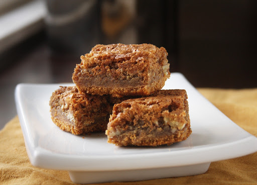 While the crust is baking, in a large bowl, whisk together the brown sugar and eggs to blend. Whisk in the graham cracker crumbs, vanilla, salt and baking powder until well-blended. Stir in the pecans.