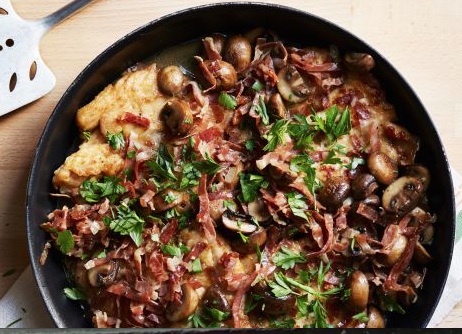 Lower the heat to medium and add the prosciutto to the drippings in the pan, saute for 1 minute to render out some of the fat. Now, add the mushrooms and saute until they are nicely browned and their moisture has evaporated, about 5 minutes; season with salt and pepper. Pour the Marsala in the pan and boil down for a few seconds to cook out the alcohol. Add the chicken stock and simmer for a minute to reduce the sauce slightly. Stir in the butter and return the chicken to the pan; simmer gently for 1 minute to heat the chicken through. Season with salt and pepper and garnish with chopped parsley before serving.