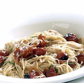 When the tomatoes are done, cook the pasta until tender, 3 to 4 minutes. Drain the pasta and return it to the pot. Immediately toss it with the garlic oil (and the garlic) and 1/2 to 1 tsp. salt. Grind lots of fresh pepper over the pasta, add the broiled tomatoes and the basil, and toss to combine well. Add half the Parmigiano, toss again, and immediately turn out into warm bowls. Top with the remaining cheese.