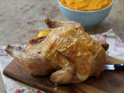 Carve the chicken and serve it with the vegetables. Save any remains from the roasting pan to add into the chicken stock.