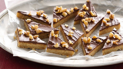 Bake 25 to 30 minutes or until very light brown (crust will be soft). Immediately sprinkle chocolate chips on hot crust. Let stand about 5 minutes or until chocolate is soft; spread evenly. Sprinkle with nuts.