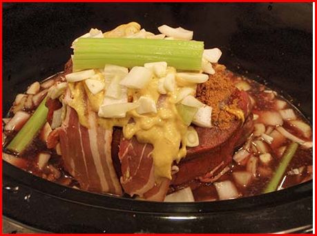 Directions: Combine all ingredients in your slow cooker. I set up the roast with the bacon on top so the fat will add flavor to the roast.