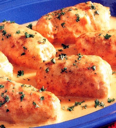 Flatten chicken to 1/8- n. thickness. Place 1 slice ham and| cheese on each breast. Roll up and tuck in ends; secure with a toothpick. Combine the flour, Parmesan cheese, sage, paprika and pepper; coat chicken on all sides. Cover and refrigerate for 1 hour.