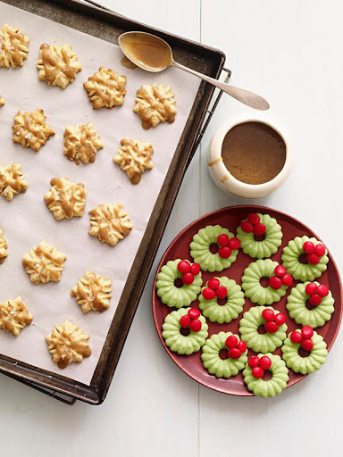 2. Spoon dough into cookie press fitted with standard wreath disk, following manufacturers directions. Press out wreaths onto large baking sheets, spacing cookies about 3/4 inch apart. Before baking, press in candy berries or confetti, if desired.