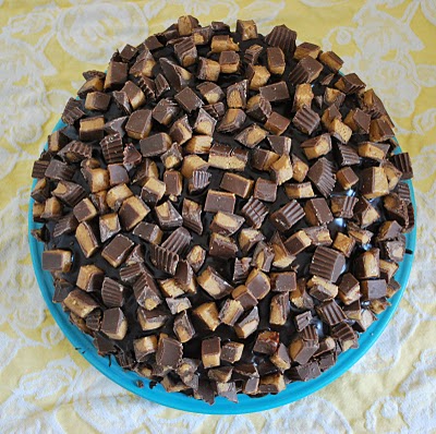 Trim the top of the cake layers flat with a serrated knife. Pour about 1 cup of the frosting on top of the bottom cake layer; spread evenly with a spatula. Top with the remaining cake layer. Pour the remaining frosting over the top, allowing it to spill over the sides. Smooth the top and sides with a spatula and then place the chopped peanut butter cups on the top and sides of the cake. Take special care when placing the Reese's on the sides of the cake as they may slide off at first. Simply press and hold them on the cake for a few seconds. For the sides, I started lining the Reese's on the bottom of the cake and worked my way up. Refrigerate for 1 hour to set.