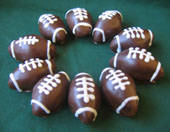 9. Decorate the footballs by drawing white circles around the edges, and laces in the middle of the balls. Allow to set completely. If desired, you can cut the excess pooled chocolate from the base of the footballs to make them look neater. Footballs can be stored in an airtight container in the refrigerator for up to two weeks. Bring to room temperature before serving.