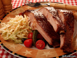 Place ribs in a large roasting pan and baste heavily with sauce. Bake 30 minutes, basting occasionally and turning once after 15 minutes. Remove ribs from pan and cut apart every 2 to 3 ribs for easier eating. Serve with remaining sauce.