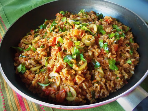 2. Add the remaining ingredients, minus the olives, stir gently to combine. Taste for salt, bring to a boil. reduce heat, cover and continue cooking for 18 to 20 minutes or until all the broth has been absorbed. add the olives, remove from heat and let stand for 10 minutes. Fluff with fork before serving. Garnish with lime juice and cilantro before serving.