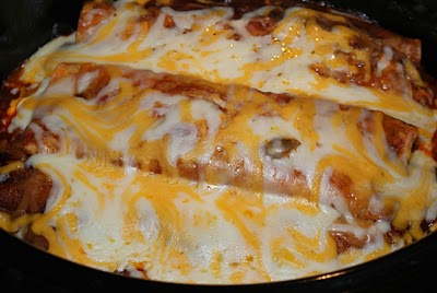 Scoop about 1/3 cup into one of the tortillas, roll it up, and nestle it into the bottom of the crock pot. Repeat with the half of the remaining filling, rolling tortillas until the entire bottom of of the crock pot is filled. Spread another cup of salsa over this layer and sprinkle it with another 1/2 cup of cheese.