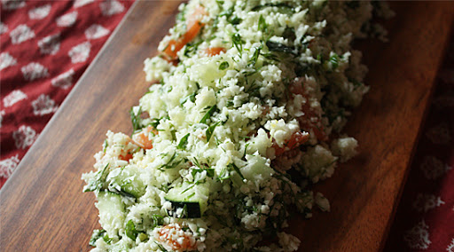 3. Transfer the cauliflower to a large mixing bowl and add the lemon zest, lemon juice, cucumber, tomato, parsley, dill, mint and olive oil. Season to taste with salt and serve at room temperature or chilled.