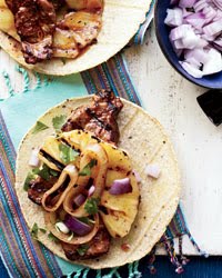 Cut the pork into strips. Serve the pork and onion with the warmed tortillas, grilled pineapple, red onion and cilantro.