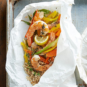 A parchment packet steams the veggies and shrimp, leaving everything brightly colored and extra-crunchy.