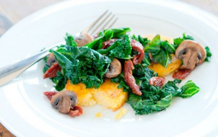 Arrange polenta on plates, spoon kale and mushroom mixture over the top, garnish with cheese and serve.
