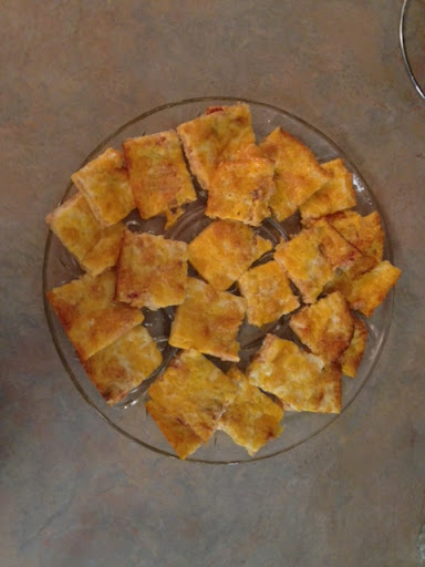 3. In a baking dish sprayed with Pam, place half of the cheese as bottom layer, then pout the sauce over the top, add the rest of the cheese. Bake 30 minutes. Let cool, cut into 1 inch squares and serve