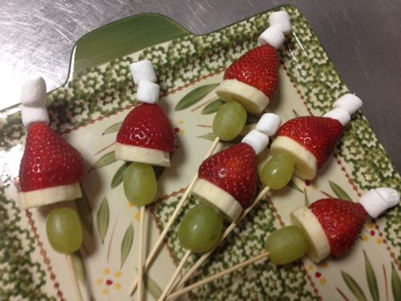 2. Starting with a grape, slide onto skewer long ways to one inch from bottom of skewer.