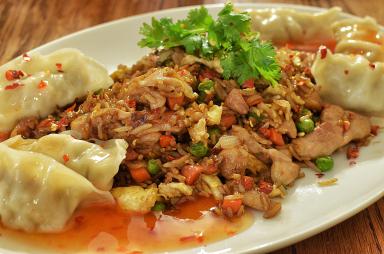 Add oil, turn down the heat to medium and stir-fry the rice. Add the soy sauce, salt, pepper and oyster sauce. Add the chicken, onion and green peas and combine thoroughly. Serve chicken fried rice with the strips of egg on top and the green onion as a garnish. (Alternately, you can mix the green onion and egg in with the other ingredients).
