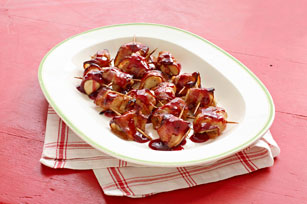 CUT bacon slices into thirds. Wrap 1 bacon piece around each chicken piece; secure with wooden toothpick. Place on baking sheet sprayed with cooking spray. Drizzle with any remaining dressing.