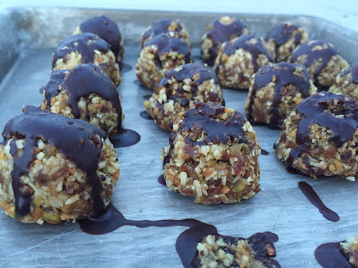 In a food processor, process the dates, coconut and pistachios.
