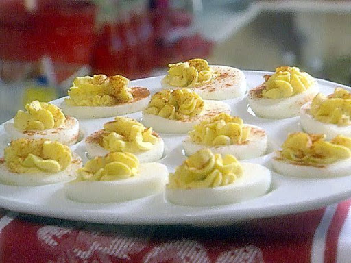 For adult occasions, a tiny amount of red or black caviar can be added as garnish on top of these eggs. Enjoy their mild mustard flavor.