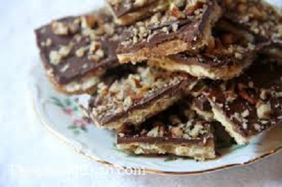 Pour the mixture over the saltines and spread to coat evenly. Bake until the toffee becomes bubbly, 8 to 10 minutes. Let cool in the pan for 5 minutes.