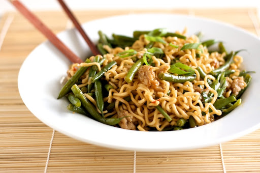 Bring salted water to a boil in a large saucepan. Add green beans and cook for 10 minutes until tender-crisp. Add noodles to water in last 3 minutes of cooking time (or as long as the package dictates). Strain and set aside.