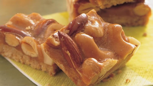 Cut up any large nuts. Sprinkle nuts evenly over crust. In 1-quart saucepan, heat all remaining ingredients over low heat, stirring occasionally, just until chips are melted. Drizzle butterscotch mixture evenly over nuts. Bake 5 minutes. For bars, cut into 8 rows by 4 rows while warm for easiest cutting.