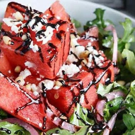 Drizzle arugula with a little bit of olive oil and season with kosher salt. Top with cubed watermelon, pickled red onions, feta cheese, and pine nuts. Drizzle generously with the balsamic reduction. Devour immediately.