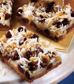 Heat oven to 350 degrees F (325 degrees for glass dish). Coat 13×9-inch baking pan with no-stick cooking spray. Combine graham cracker crumbs and butter. Press into bottom of prepared pan. Pour sweetened condensed milk evenly over crumb mixture. Layer evenly with chocolate chips, coconut and nuts. Press down firmly with a fork. Bake 25 minutes or until lightly browned. Cool. Cut into bars or diamonds. Store covered at room temperature.