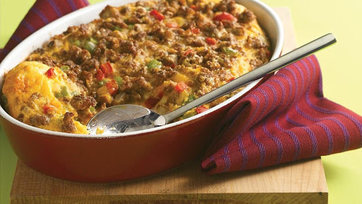 Heat oven to 375 degrees. Spray a 13 x 9 inch (3 quart) glass baking dish with cooking spray. In a 10 inch skillet, brown sausage, onions and bell peppers, drain well.