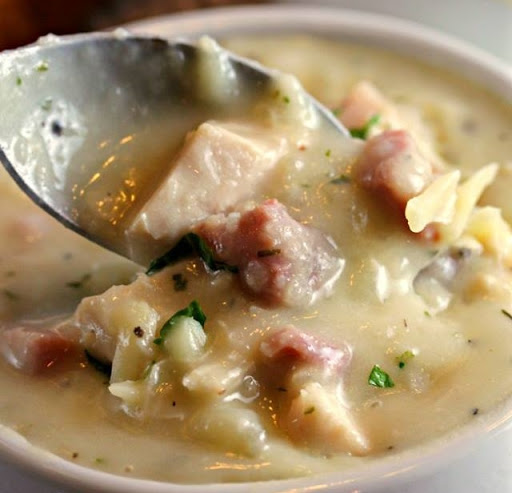 1. Add diced potatoes, onion, carrot, chicken, ham, thyme, parsley, pepper, dijon & broth to a large pot.