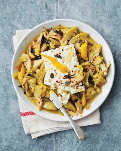 Preheat oven to 350 degrees. Place feta in middle of a 9-inch pie dish. Pour oil over cheese; sprinkle remaining ingredients on and around it. Cover with parchment-lined foil and bake until heated through, about 40 minutes. Let cool slightly before serving with crackers or crostini.