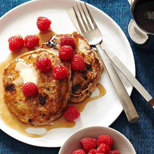 In a medium bowl stir together whole wheat flour, baking powder, and salt. In a small bowl combine egg, milk, mashed banana, and 1 tablespoon of the syrup. Add egg mixture all at once to flour mixture. Stir just until moistened (batter should be slightly lumpy). Fold in chocolate.