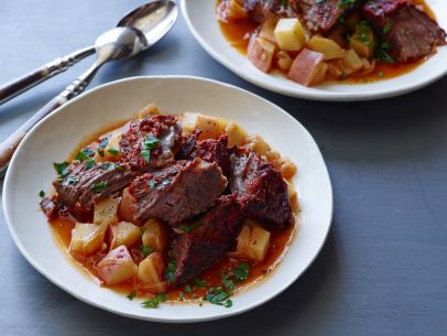 Meanwhile, cut the meat away from the bone, removing the connective tissue and discarding. Once the potatoes are tender, uncover and set the meat atop the vegetables. Cover and continue to cook for 10 minutes. Serve sprinkled with the parsley.