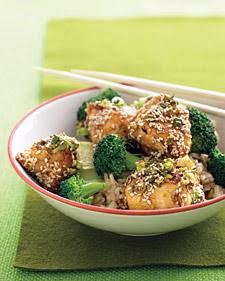 4. Meanwhile, place saucepan with steamer basket over high heat; bring water to a boil. Add broccoli, and cook until crisp-tender, 4 to 6 minutes. Serve sesame chicken with broccoli and rice.
